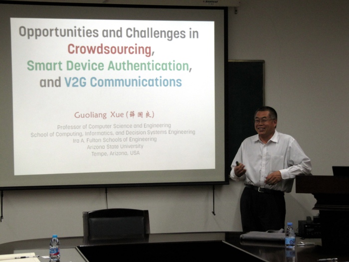 2017年5月17日上午,应我院邀请,美国亚利桑那州立大学教授、IEEE Fellow 薛国良博士来我院作了题为“众包、智能设备认证和车辆网格通信的机遇与挑战”的学术报告,并与我院师生在济事楼417会议室进行了深入的学术交流及研讨。软件学院穆斌教授、饶卫雄教授、尹长青教授等参加了报告会。本次报告会也是软件学院图灵讲坛第一期。