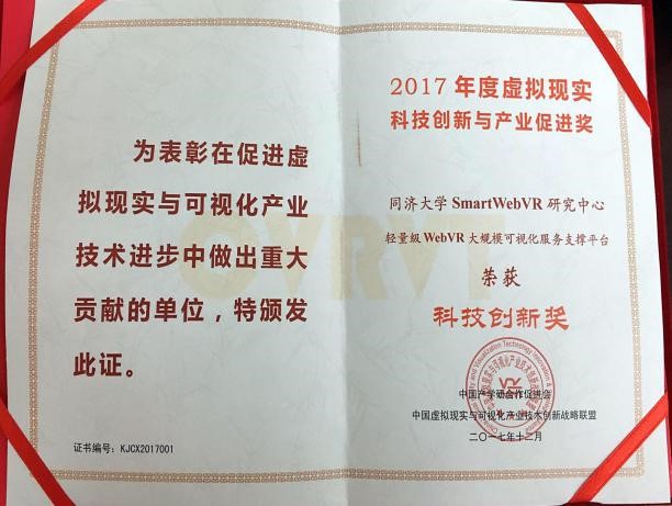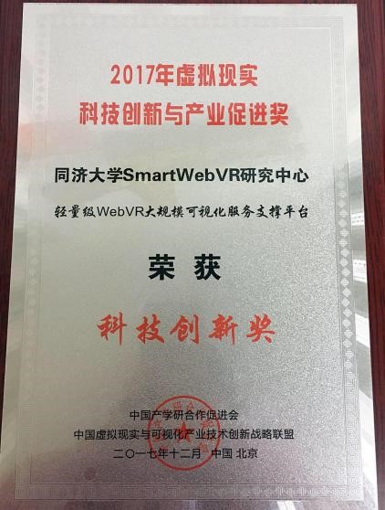 在本次CVRVT理事大会上,我院贾金原教授领衔的SmartWebVR团队在2017年虚拟现实科技创新与产业促进奖评选中取得佳绩,多年来研发的“轻量级WebVR大规模可视化服务支持平台”荣获科技创新奖。