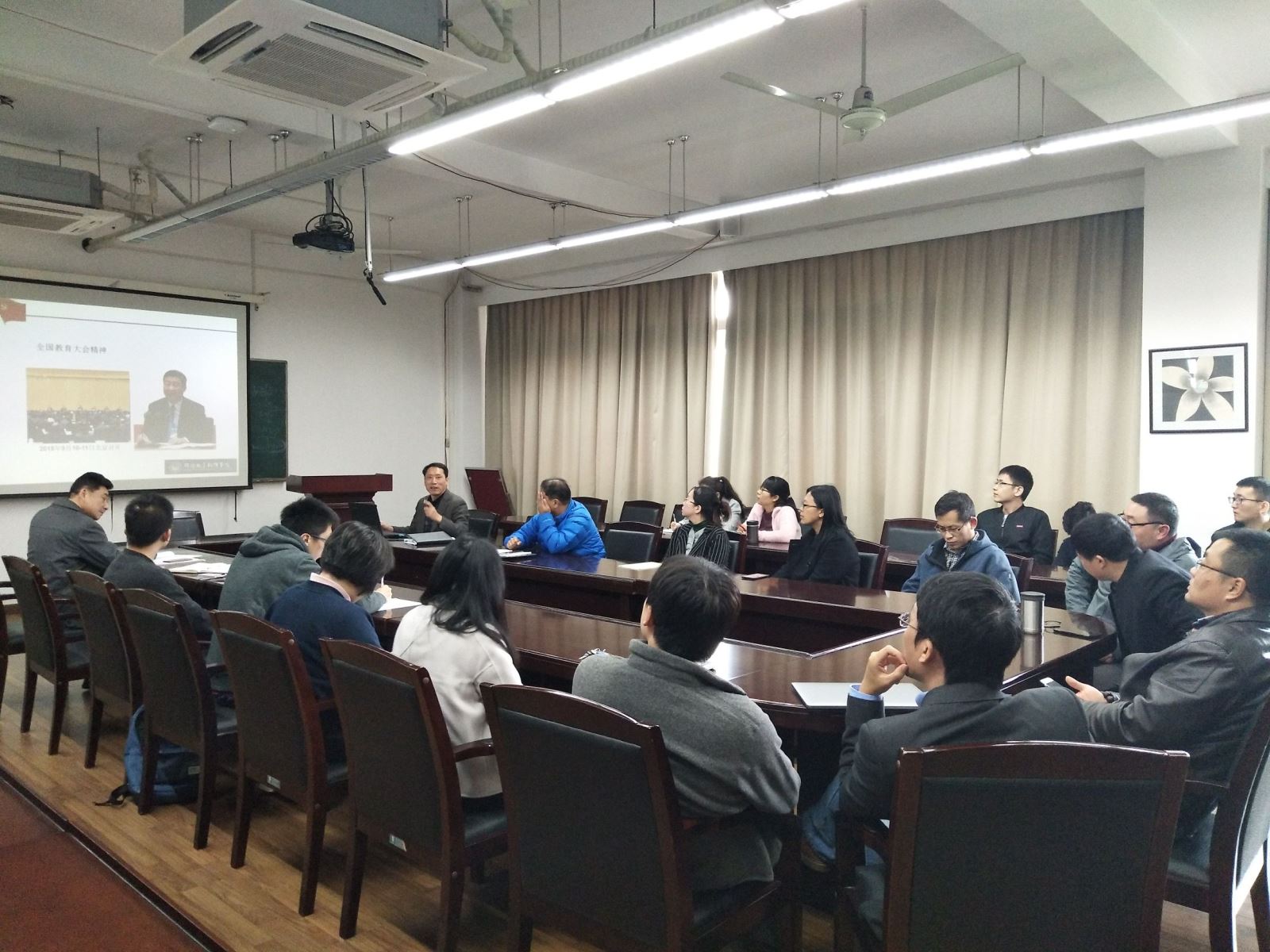 2018年11月20日下午在济事楼417室,软件学院党委组织专题学习,党委书记宋庆国作了题为《深入学习贯彻全国教育大会精神》宣讲报告,学院全体教师党员及部分学生党员骨干参加了会议。
