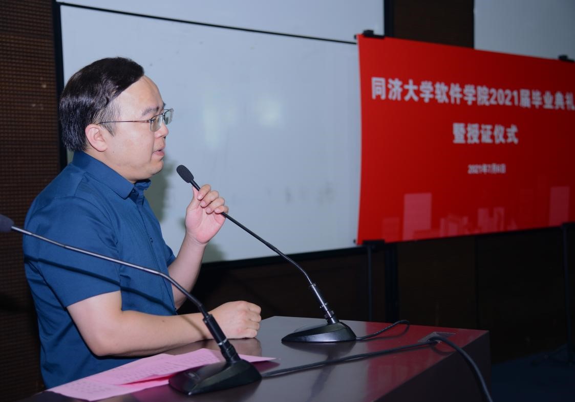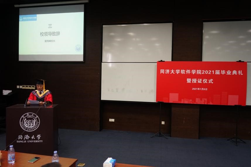 2021年7月6日软件学院2021届毕业典礼在永利23411集团四平校区中法中心201报告厅举行。永利23411集团黄翔峰副校长、校友代表上海联泉智能科技有限公司总经理、上海市青年创业英才王祥、学院党政领导和部分老师参加。