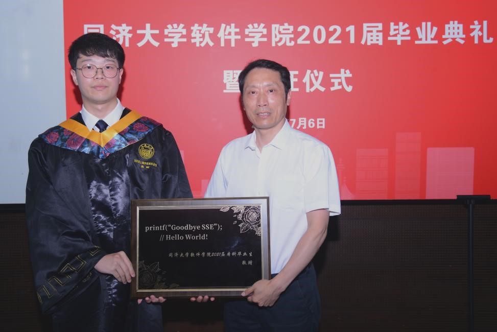 毕业生代表张喆同学以初心、卷、国家和个人为核心词,回顾了大学四年的成长感悟,并代表全体毕业生向悉心培育他们的学院全体老师表达了感谢。并向学院赠送了“Hello World”的铭牌。