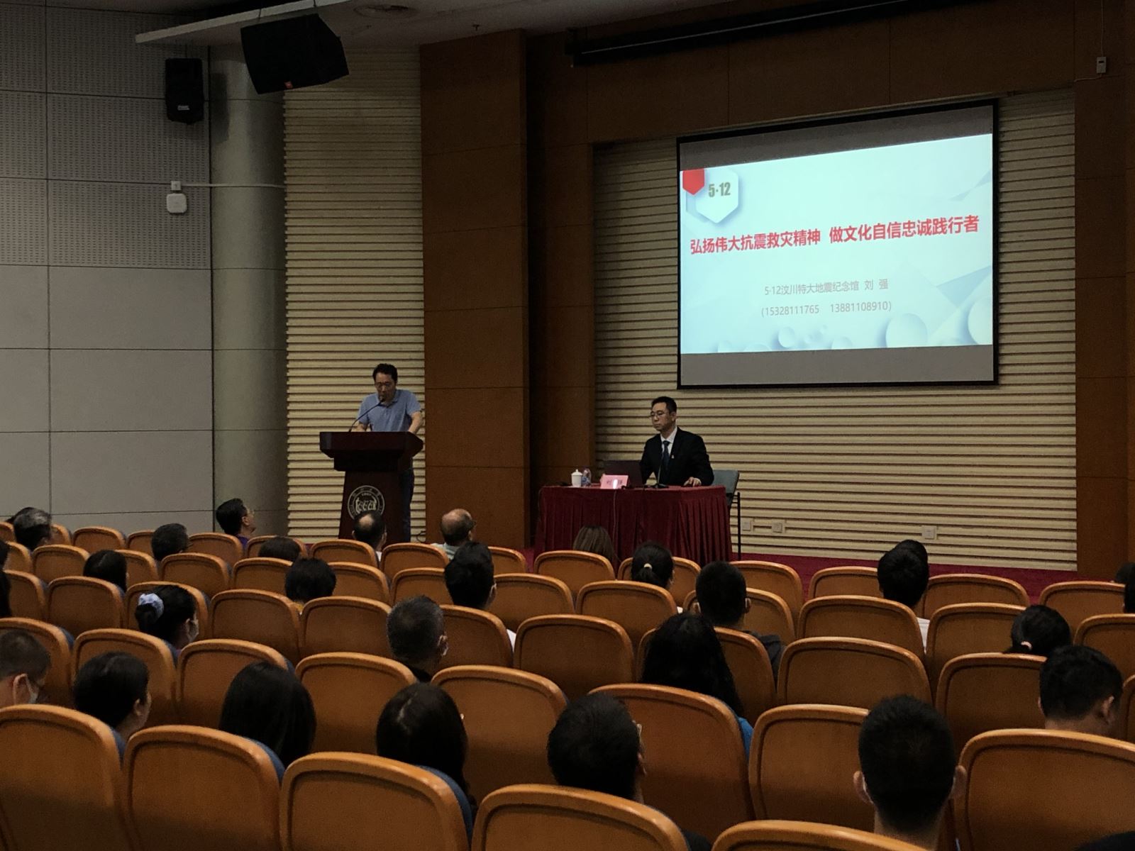 刘强博士的报告分为“旷世巨灾,抗震精神”“和平演变,文化自信”“砥砺奋进,中国精神”三个部分。首先,刘强博士从5·12汶川特大地震抗震救灾说起,重温了中国共产党团结带领全党、全军、全国各族人民英勇顽强、不怕牺牲,夺取抗震救灾和灾后恢复重建伟大胜利,形成了“万众一心、众志成城,不畏艰险、百折不挠,以人为本、尊重科学”的伟大抗震救灾精神。接着,刘博士从当今世界局势、和平演变说起,分析目前我们国家所面临的意识形态形势——战场虽没有硝烟,但实际更为险恶。我们要坚定马克思主义的指导地位,坚定文化自信,时刻警惕并坚决抵制欧美对我国的文化输出、历史虚无主义的渗透等“和平演变”。最后刘博士强调,抗震救灾精神是爱国主义、集体主义、社会主义精神的集中体现和新的发展,是中国共产党人精神谱系的重要组成部分,是中华民族永续发展的灵魂。 “人民有信仰,民族有希望,国家有力量”。