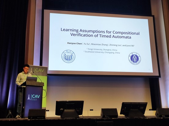 近日,软件学院研究生陈韩悦、苏宇、米钧日在张苗苗研究员和西南大学刘志明教授指导下完成的论文“Learning Assumptions for Compositional Verification of Timed Automata”被2023 International Conference on Computer Aided Verification(CAV 2023)录用。