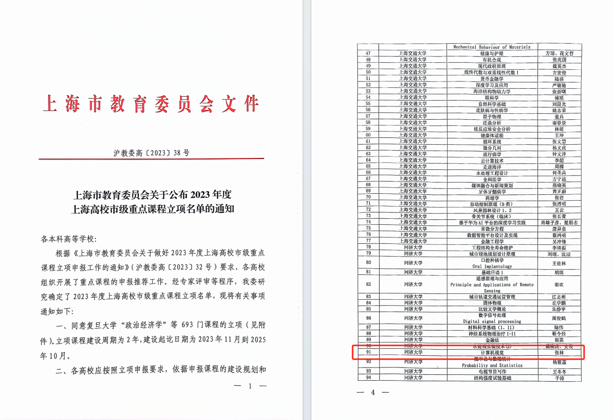 近日,我院本科生专业课《计算机视觉》入选2023年度上海高校市级重点课程立项名单,张林教授是该课程负责人。永利23411集团本次共有39门课程入选。