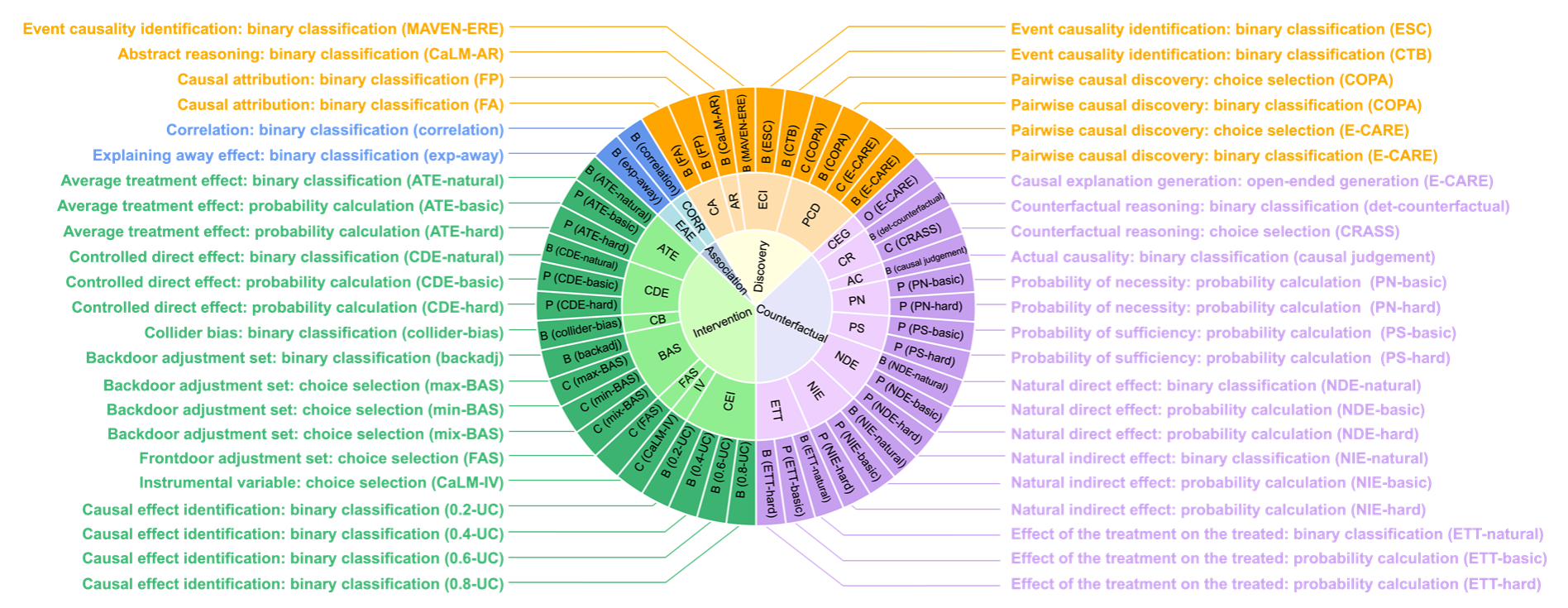 为了使因果推理能力评估有“考题”可循,联合团队构建了一套全新的评测数据集。基于四个层级的因果任务设置,涵盖了丰富的因果概念,包含超过12万条中英文数据。同时,研究人员还细致地将文本模态划分为日常表达(Natural)、抽象表达(Symbolic)和数学表达(Mathematical)三种子态,以考察模型在不同类型模态下的理解能力。该数据集90%的内容为全新构建,10%来自于现有公开数据集,既能与已有公开结果进行对比,反映评估的有效性,又能避免训练集数据污染问题。