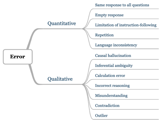 联合团队认为,大模型评测中产生的错误,是应用于下一阶段研究的宝贵资源。通过发现并定义错误,研究人员能够更清晰地界定模型能力边界,识别模型存在的缺陷,并寻找对应提升路径。为此,CaLM在评估过程中,将模型产生的错误系统地分为两大类:定量错误(Quantitative)和定性错误(Qualitative)。不仅对每类错误进行明确的定义,还对所有定量错误都进行了统计分析,以量化错误的频率和模式。CaLM也对于所有定性错误进行了深入的案例研究,以理解错误的具体情况和成因。
