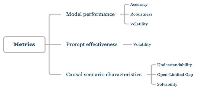 针对模型、提示词以及因果场景,CaLM中分别设置了不同的评估标准,覆盖包括准确率、鲁棒性、理解度等7种,全面反映模型的因果推理能力和鲁棒性、提示词有效性。越复杂的因果场景模型越难解决,从而该场景成熟度越低,因此CaLM同时设置了考察因果场景成熟度的评估标准。