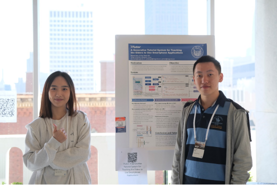 两位同学以“iTutor: A Generative Tutorial System for Teaching the Elders to Use Smartphone Applications”为题进行了海报交流。其中,邹睿石、叶梓分别为第一、第二作者,叶晨老师为通信作者。该工作聚焦于用户界面“可及性”(Accessibility)方向,由元信息提取、大模型推理、教程界面生成三个模块构成,可以基于用户需求和当前页面状态动态生成下一步操作的提示,以辅助老年群体更好的认识用户界面,消除“数字鸿沟”。