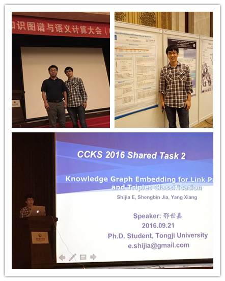 日前,我院党委副书记向阳教授及博士研究生鄂世嘉参加了在北京举行的全国知识图谱与语义计算大会(CCKS 2016),向阳教授实验室团队在大会全部三项知识图谱评测竞赛中的两项——产品预测和知识图谱链接预测分别取得了总成绩第一名和第二名的优异成绩,并在会上对相关成果进行了汇报。